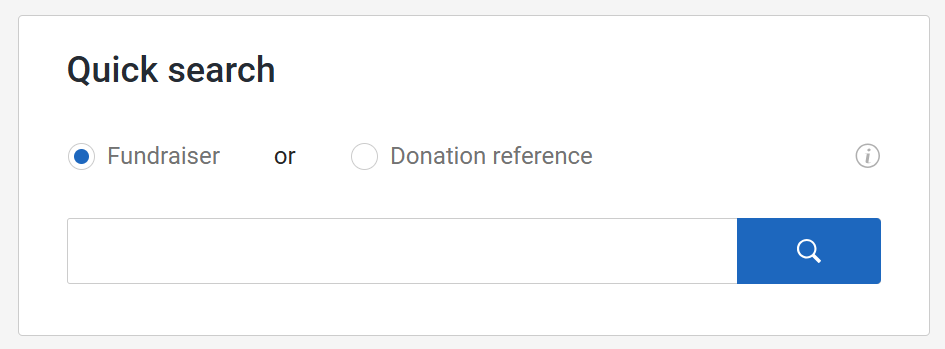 You can use this to search for any Fundraisers who have created Fundraising pages for your organization by name, or any donations that have been made to your organization by donation reference.